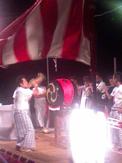 海岸で しゃぎり太鼓の出し物 レンガか丸太を30cm位に切ったもの