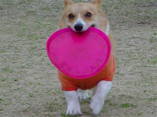 硬いフリスビーは割れて口を切ったり、歯をいためるから最近は、これを使ってま〜す。」