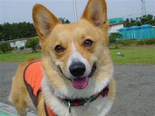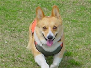 目がやや細い おとなしく臆病な性格 薄い黄色(ベージュ)の胴輪(ハーネス)