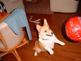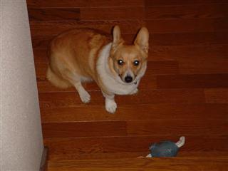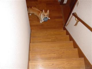 そして、2階に着替えに行くと、遊んでもらおうとおもちゃをくわえて階段下まで追いかけていく。