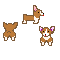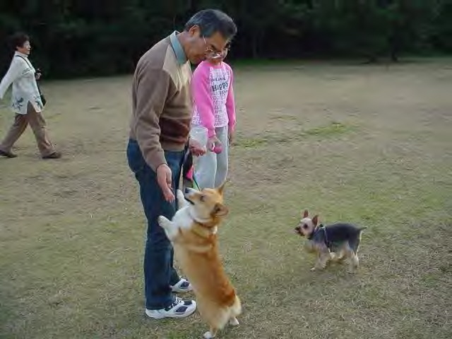 太郎ちゃんは、一瞬コーギーに見えないと思う人もいるかもしれないけど、ロングの列記としたペンブローグの仲間なんだ。また、小梅ちゃんはおなかを見せさせたら公園でNO.1で、本当にかわいいんだから・・。